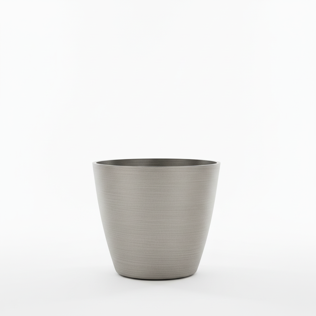 Vazo plastike me formë të ngushtuar dhe përfundim argjend metalik, ideale për vendosjen e bimëve ose luleve dekorative në shtëpi apo zyrë.