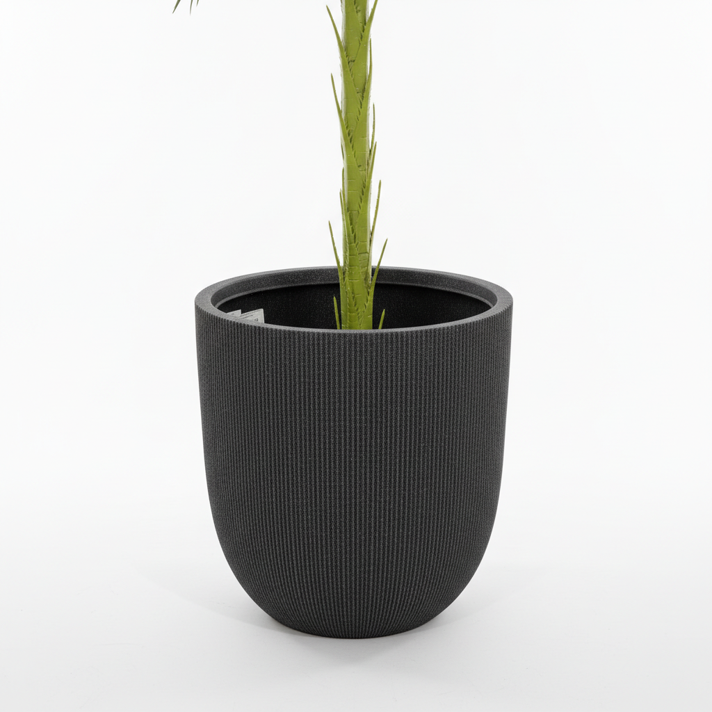 Vazo dekorative e madhe me dizajn mesdhetar, teksturë vertikale me vija dhe përfundim gri të errët me pika, e përshtatshme si mbajtëse bimësh ose element dekorativ.