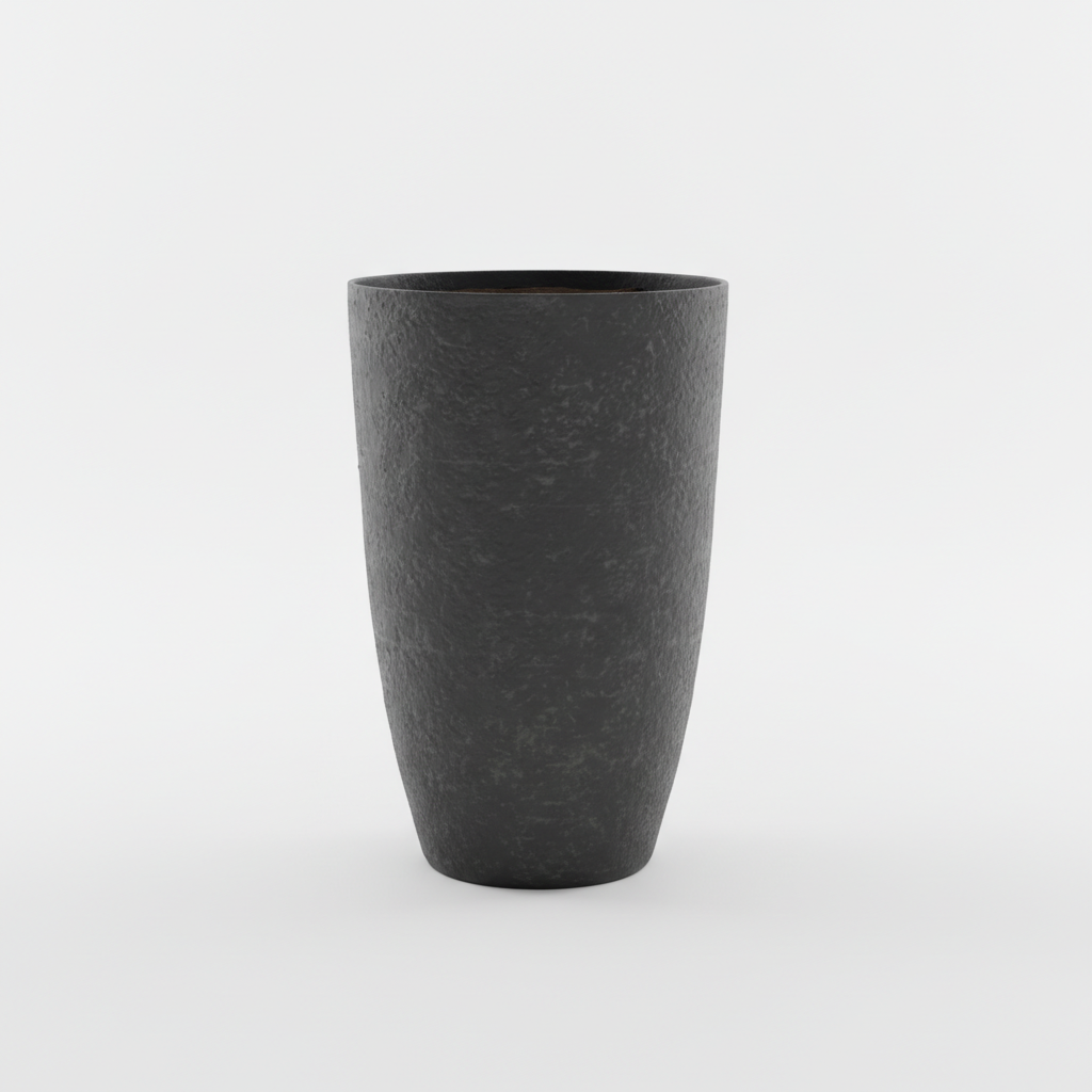 Enë plastike e lartë me formë cilindrike dhe sipërfaqe të teksturuar gri të errët, ideale si vazo dekorative ose tenxhere për lule. E përshtatshme për arredim modern në ambiente të brendshme ose të jashtme të mbuluara.