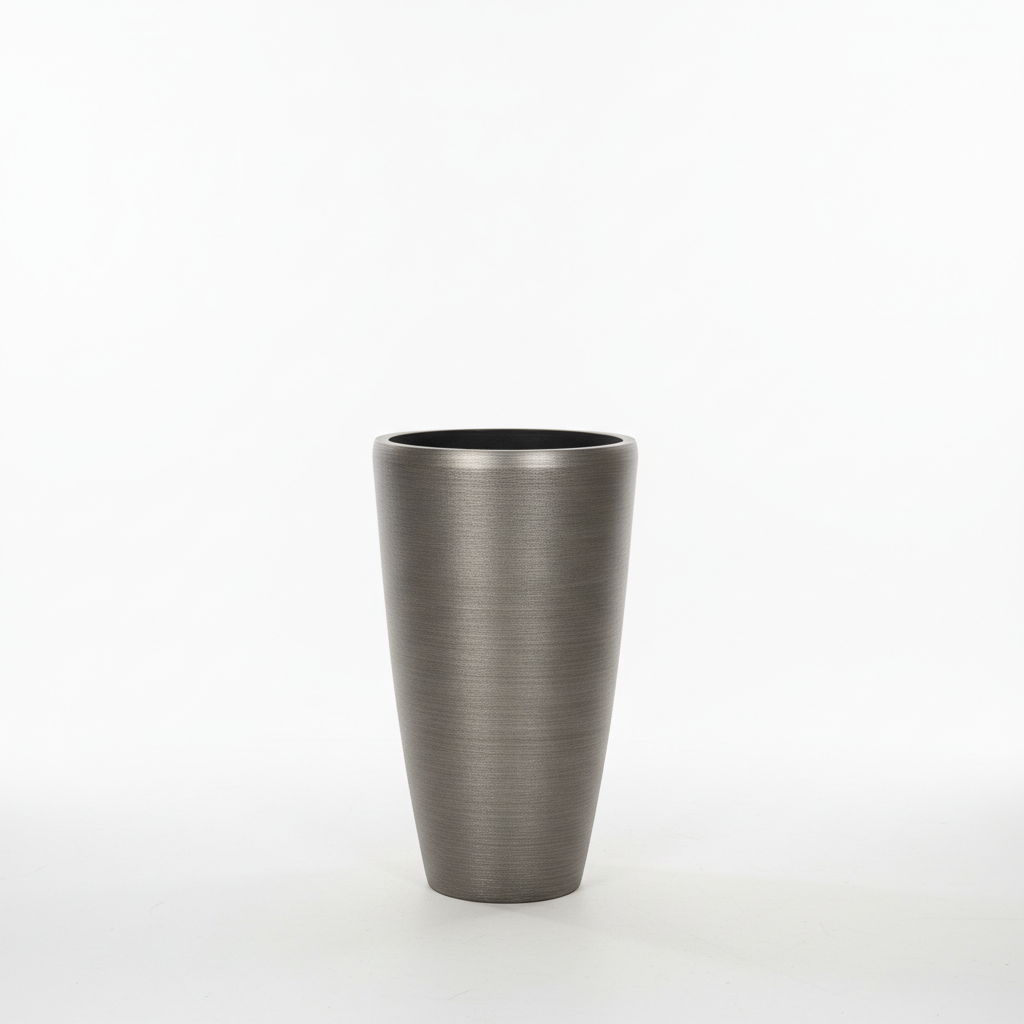 Vazo e lartë plastike me formë cilindrike dhe pamje metalike sjell stil modern për çdo ambient, ideale për bimë të brendshme ose të jashtme. E përshtatshme për mbajtje uji, ajo kombinon dizajnin dekorativ me funksionalitet praktik.