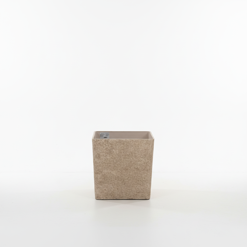 Vazo dekorative katrore me pamje guri, ideale për bimë ose pemë të vogla në ambientet tuaja të brendshme ose të jashtme. Ngjyra neutrale bezhë kombinon lehtësisht me çdo stil mobilimi.