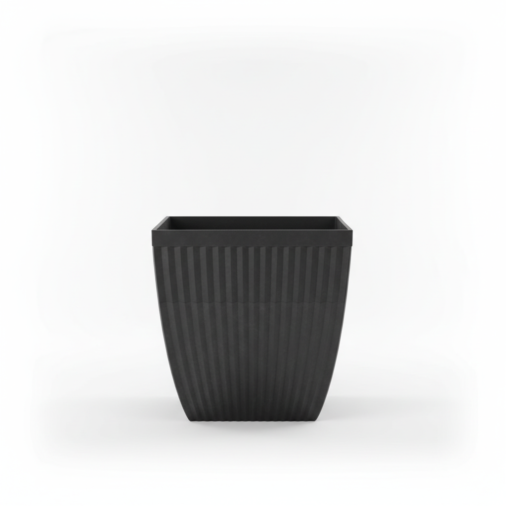 Vazo dekorative e mesme në ngjyrë charcoal black me dizajn të jashtëm me vija vertikale, ideale për bimë dhe dekor modern në ambiente të brendshme ose vitrinë. Forma katrore dhe materiali plastik i lehtë e bëjnë të thjeshtë vendosjen dhe kombinimin me mobiliet.