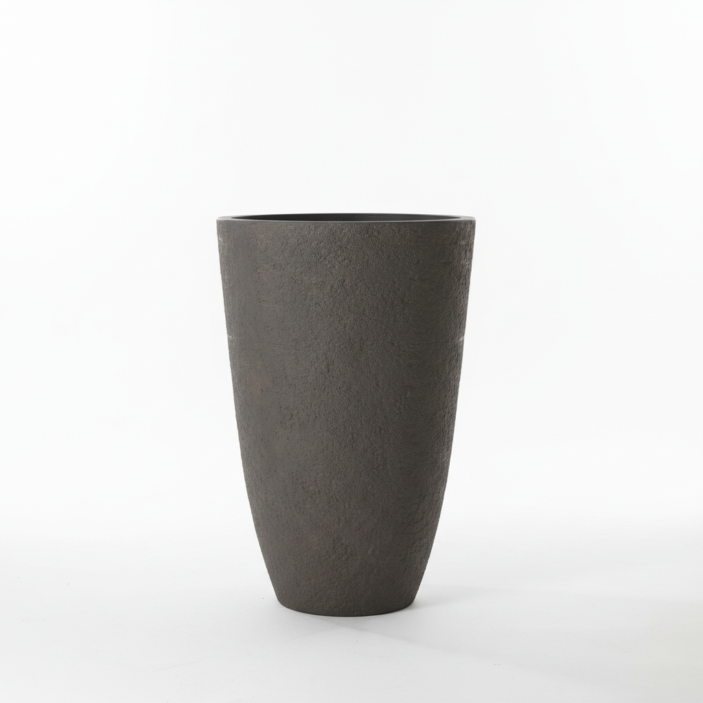 Vazo dekorative me madhësi mesatare dhe sipërfaqe të teksturuar, ideale për vendosjen e bimëve dekorative brenda çdo ambienti.