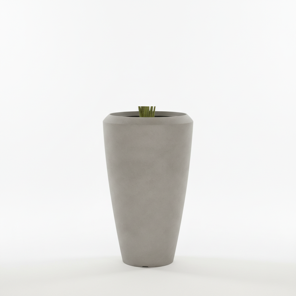 Vazo plastike e lartë në ngjyrë gri me formë cilindrike të ngushtuar, e përshtatshme si vazo bime ose element dekorativ në ambientet tuaja. Prodhim nga Kina.