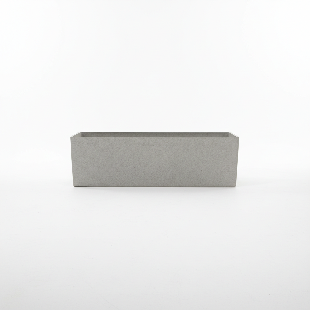 Vazo dekorative drejtkëndore në ngjyrë gri çimento, ideale për vendosjen e luleve ose bimëve si brenda ashtu edhe jashtë.