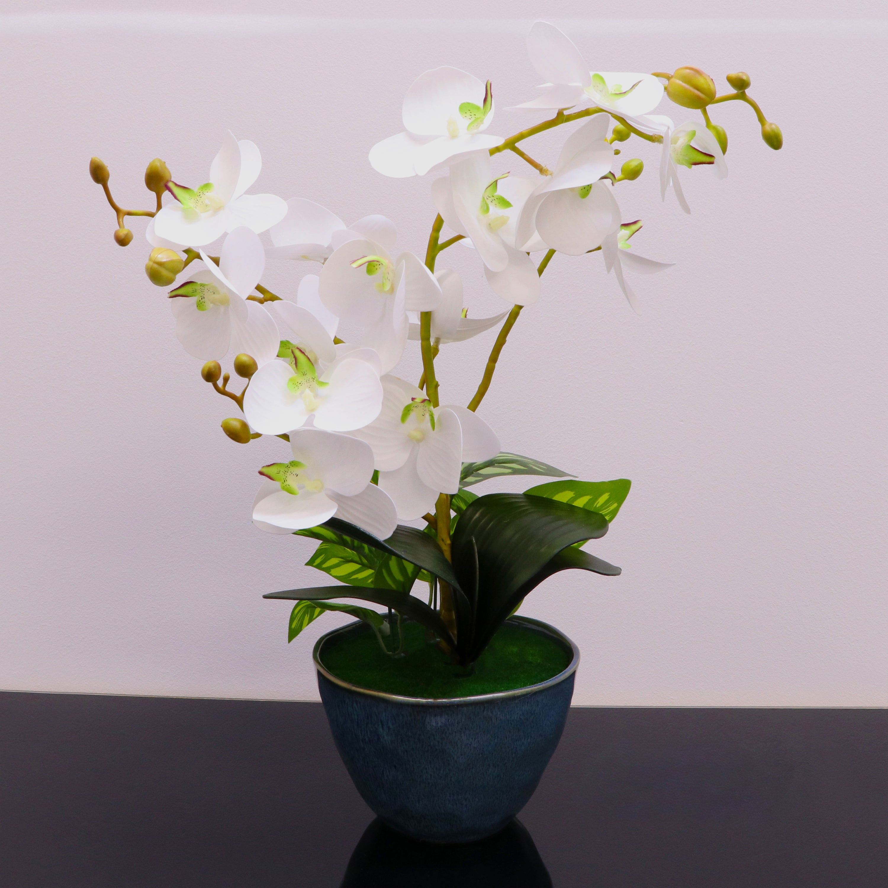Orkide artificiale dekorative me lule të bardha elegante dhe detaje delikate në nuanca jeshile, e krijuar për të sjellë finesë dhe luks në çdo ambient. Petalet me formë natyrale dhe sythat e vegjël dekorativë i japin një pamje shumë realiste dhe të rafinuar.