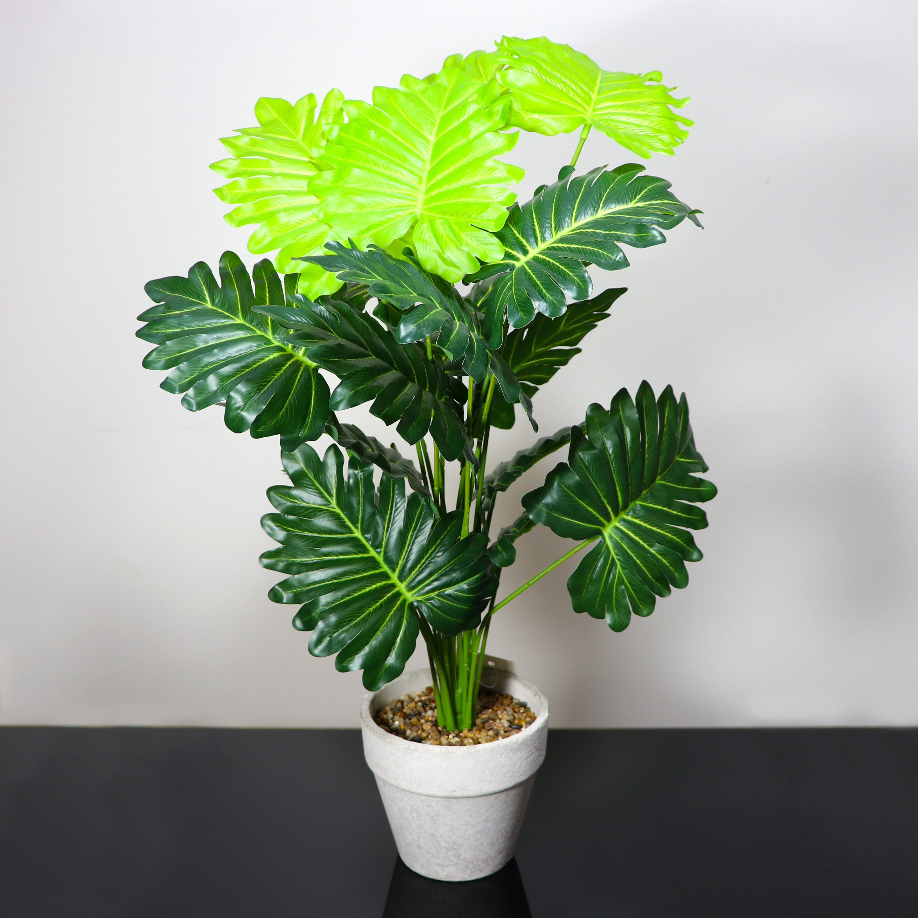 Vazo dekorative me gjethe artificiale në tonalitete jeshile të theksuara, e dizajnuar për të sjellë freski dhe stil modern në çdo ambient. Gjethet e mëdha me teksturë të detajuar dhe nuanca kontrastuese krijojnë një pamje realiste dhe elegante.