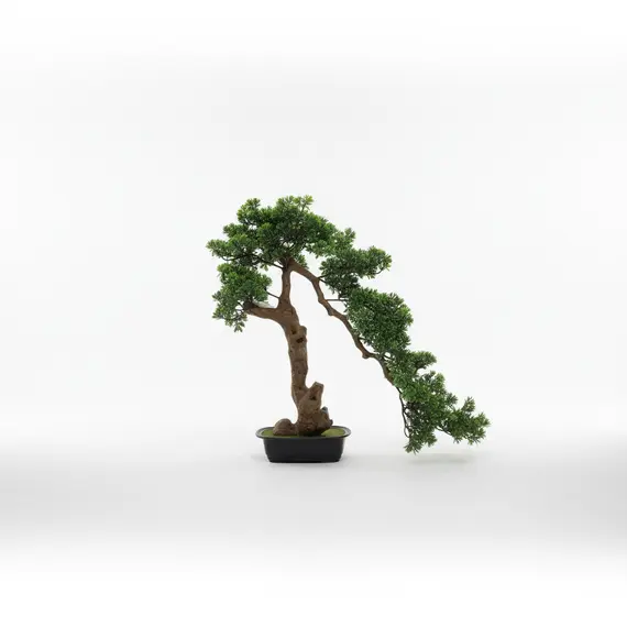 Pemë bonsai artificiale me dizajn realist, ideale për t’i sjellë gjelbërim dekorit të brendshëm pa nevojë për mirëmbajtje. Kombinon trungun e përdredhur natyral me gjethnajë të dendur jeshile për një pamje elegante.