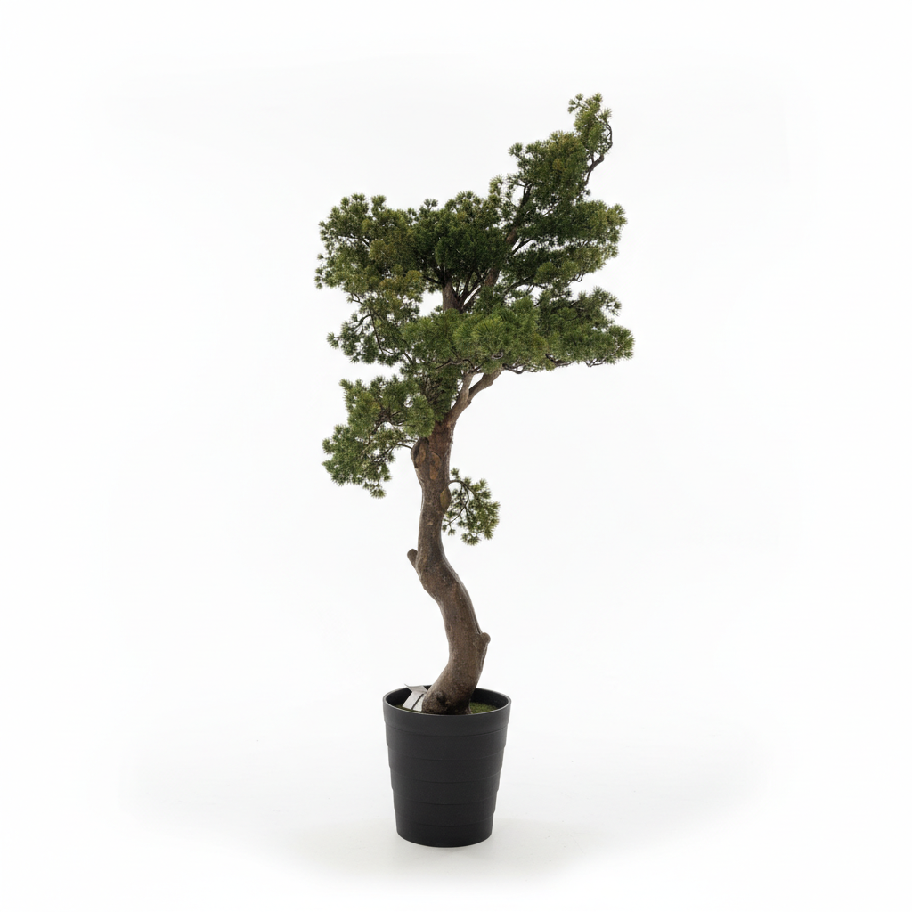 Bimë dekorative artificiale e stilit bonsai me trung të lakuar realist dhe gjethe të dendura jeshile, e vendosur në një vazo cilindrike të zezë për ambiente të brendshme moderne. Shton gjelbërim dhe stil në çdo kënd pa nevojë për mirëmbajtje.