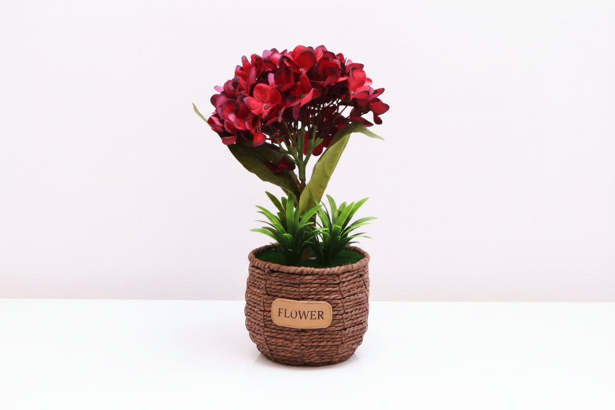 Vazo dekorative me lule artificiale me petale të kuqe intensive dhe pamje shumë realiste, të vendosura në një vazo natyrale me efekt thurje. Kombinimi i ngjyrës së kuqe me gjelbërimin e gjetheve krijon një kontrast të bukur dhe të gjallë për çdo ambient.