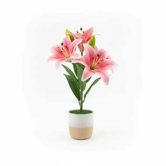 Arritni një pamje të freskët dhe elegante në çdo ambient me këtë vazo dekorative me zambak rozë artificial në saksi qeramike dyngjyrëshe. Ideale për shtëpi ose zyrë, ofron bukurinë e luleve pa pasur nevojë për ujitje.
