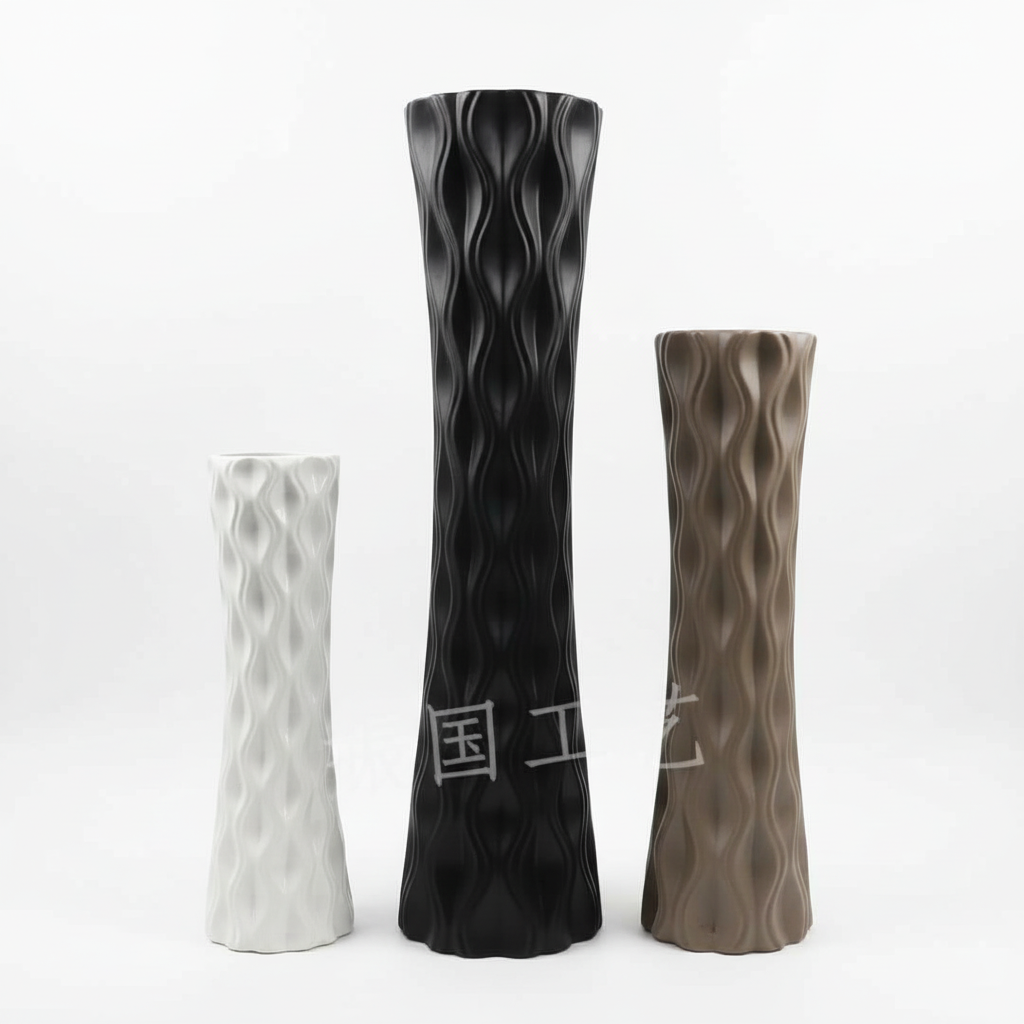 Vazo e lartë dyshemeje me sipërfaqe të punuar në reliev valësh i jep një pamje moderne çdo ambienti. Ideale për dekorimin e këndeve me lule artificiale ose të thata.