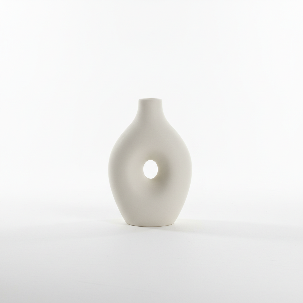 Vazo dekorative qeramike me formë organike dhe hapje qendrore, ideale për t’i dhënë një prekje moderne çdo ambienti. Ngjyra e hapur dhe silueta skulpturore e bëjnë një pikë fokale elegante në tryezë ose rafte.
