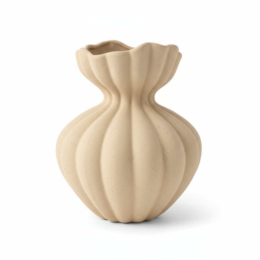 Kjo vazo dekorative prej qeramike cilësore sjell një prekje natyrale dhe moderne në shtëpinë tuaj, falë sipërfaqes me përfundim mat dhe teksturë të lehtë. Ngjyra bej/ranore kombinohet lehtësisht me dekorin ekzistues, ndërsa forma voluminoze me vijëzime të buta e kthen në një element të veçantë vizual edhe kur përdoret pa lule.