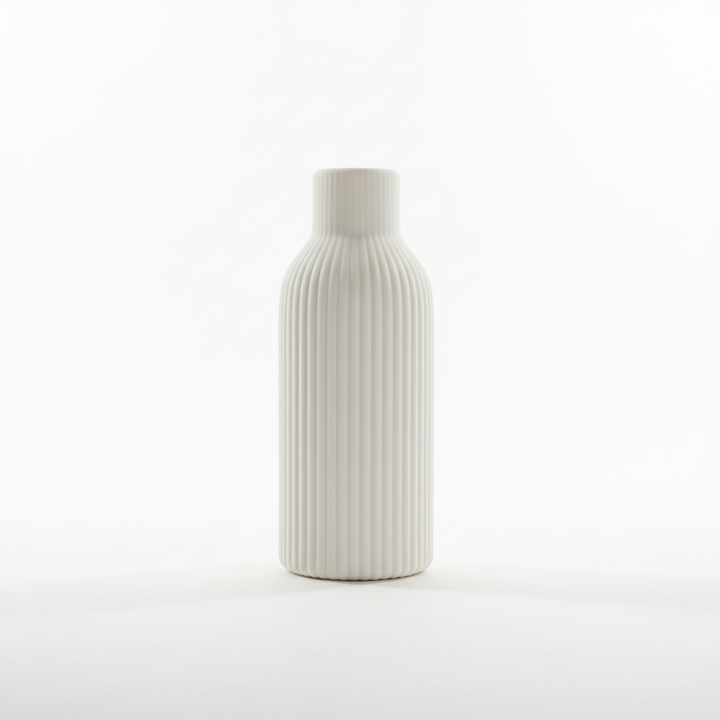 Vazo cilindrike qeramike e bardhë me teksturë vertikale, ideale për të theksuar çdo hapësirë interieri. Forma e saj elegante i jep një pamje moderne si me lule ashtu edhe si dekor më vete.