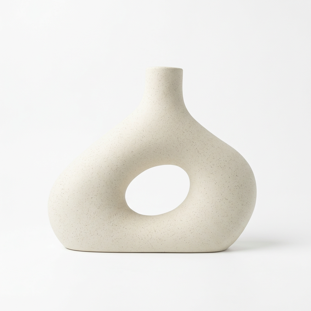 Kjo vazo qeramike me formë skulpturore dhe hapje qendrore sjell një prekje të sofistikuar minimaliste në sipërfaqet tuaja të preferuara. Sipërfaqja mat me pika delikate krijon një efekt unik dekorativ që kombinohet lehtësisht me stile të ndryshme interieri.