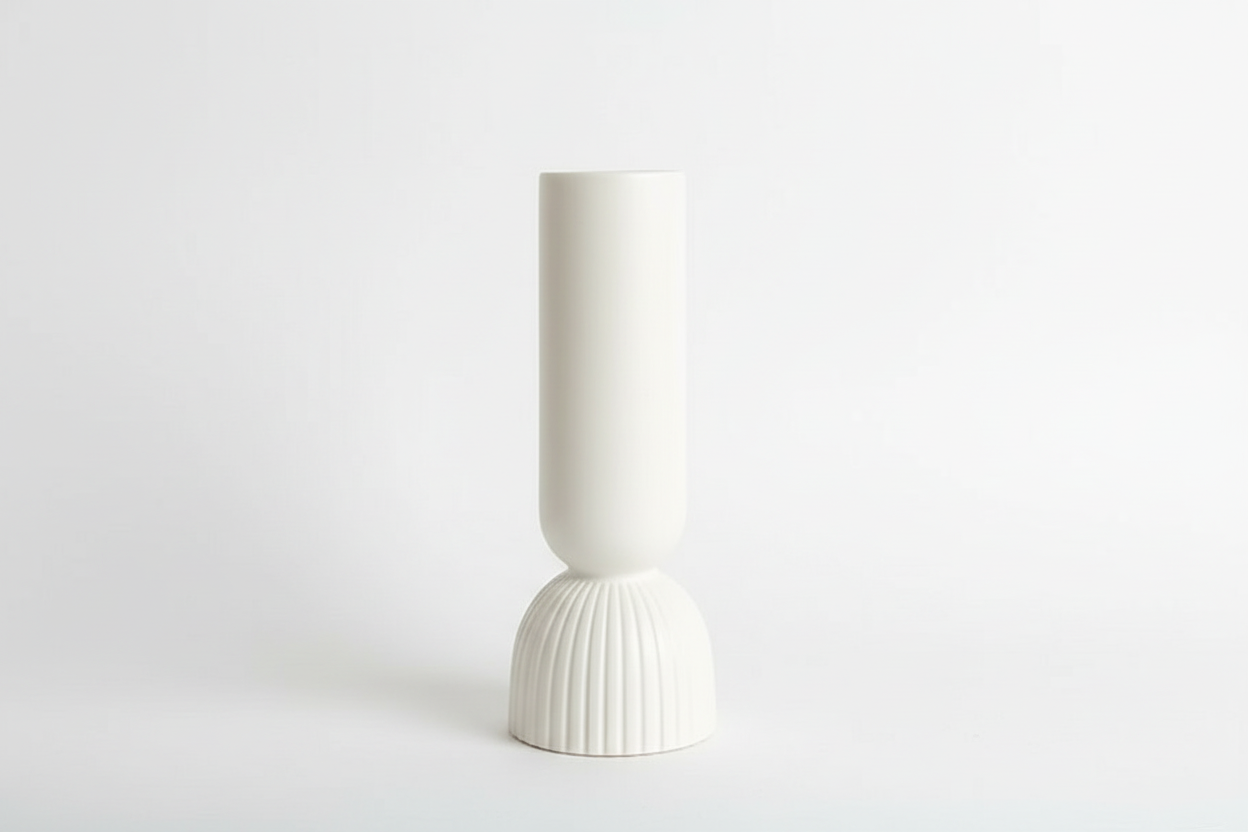 Vazo dekorative e bardhë me dizajn minimalist dhe siluetë elegante vertikale. Forma cilindrike e zgjatur kombinohet me bazën e teksturuar me vija vertikale, duke krijuar një kontrast të bukur mes thjeshtësisë dhe detajit.