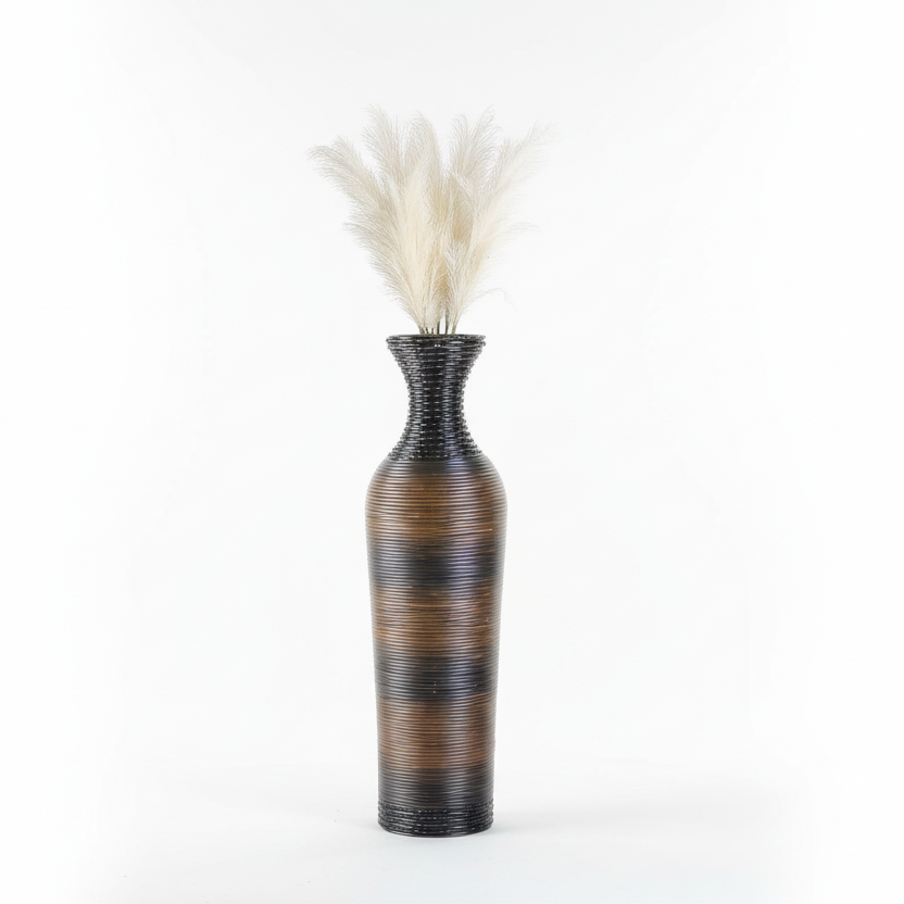Kjo vazo dekorative me formë të gjatë dhe dizajn të rafinuar është një element ideal për të kompletuar ambientet e brendshme dhe të jashtme të mbuluara. Linjat horizontale dhe kombinimi i toneve të errëta me nuanca natyrale krijojnë një pamje elegante dhe moderne që përshtatet lehtësisht me stile të ndryshme arredimi.