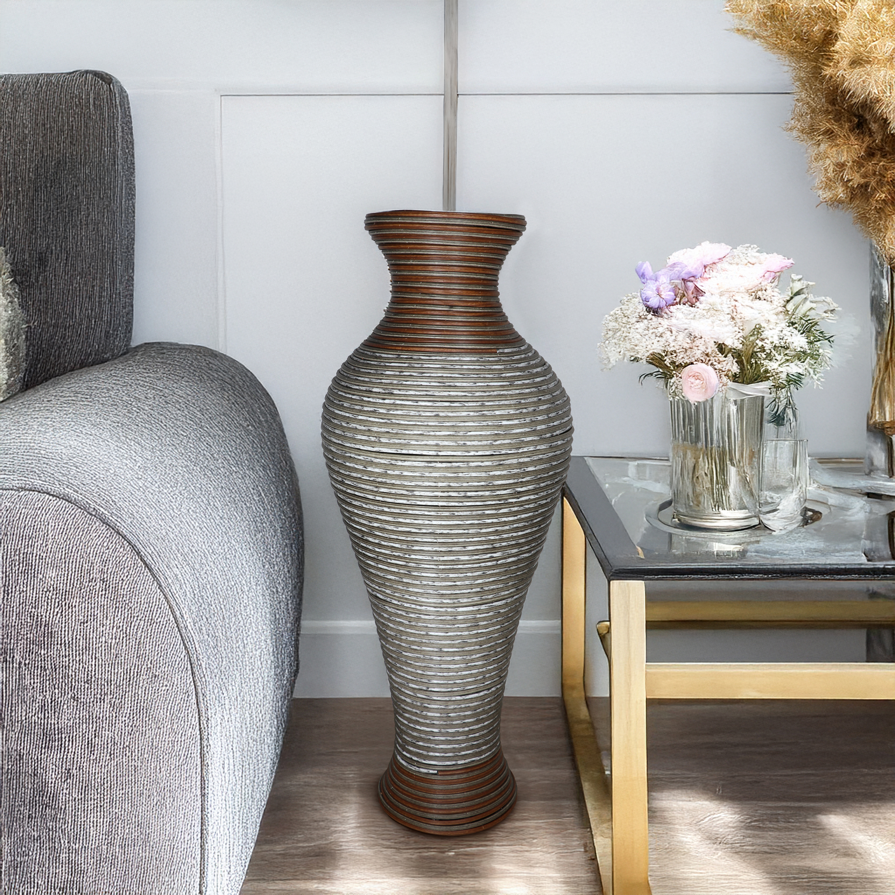 Vazo dekorative me dizajn të lartë dhe elegant, e punuar me strukturë horizontale që krijon një efekt vizual modern dhe të sofistikuar. Kombinimi i nuancave natyrale gri me detaje në tonalitet kafe të ngrohtë e bën këtë vazo ideale për ambiente bashkëkohore dhe klasike.