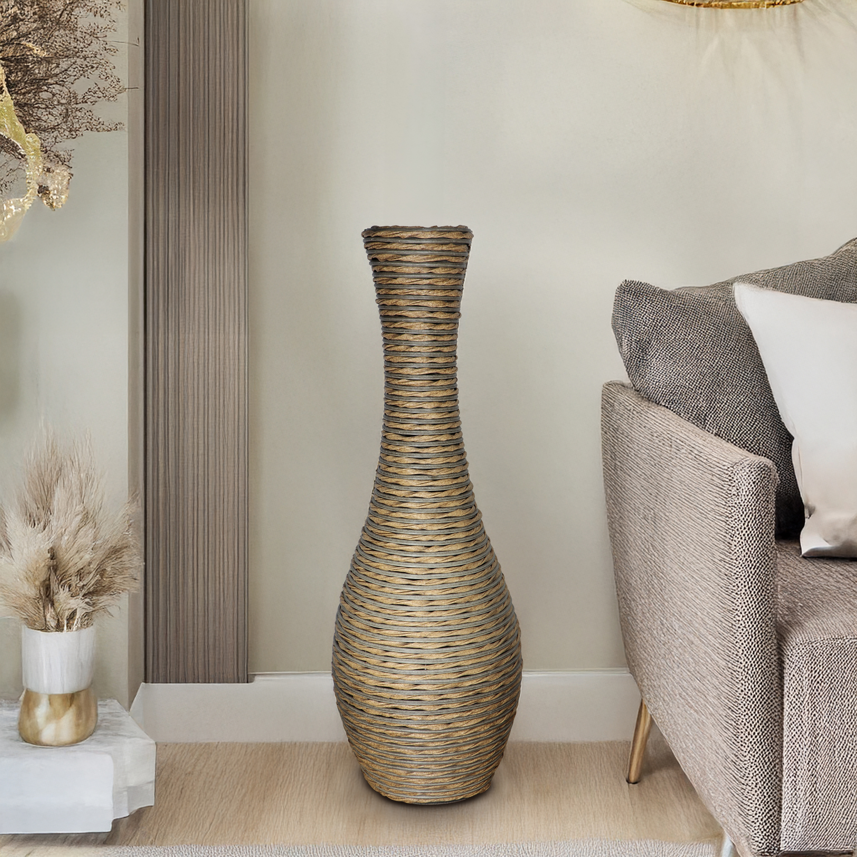 Vazo dekorative e gjatë për dysheme me dizajn elegant dhe teksturë spirale që i jep thellësi dhe karakter çdo ambienti. Forma e saj e ngushtë në qafë dhe e rrumbullakosur në pjesën e poshtme krijon një siluetë të balancuar dhe shumë estetike.