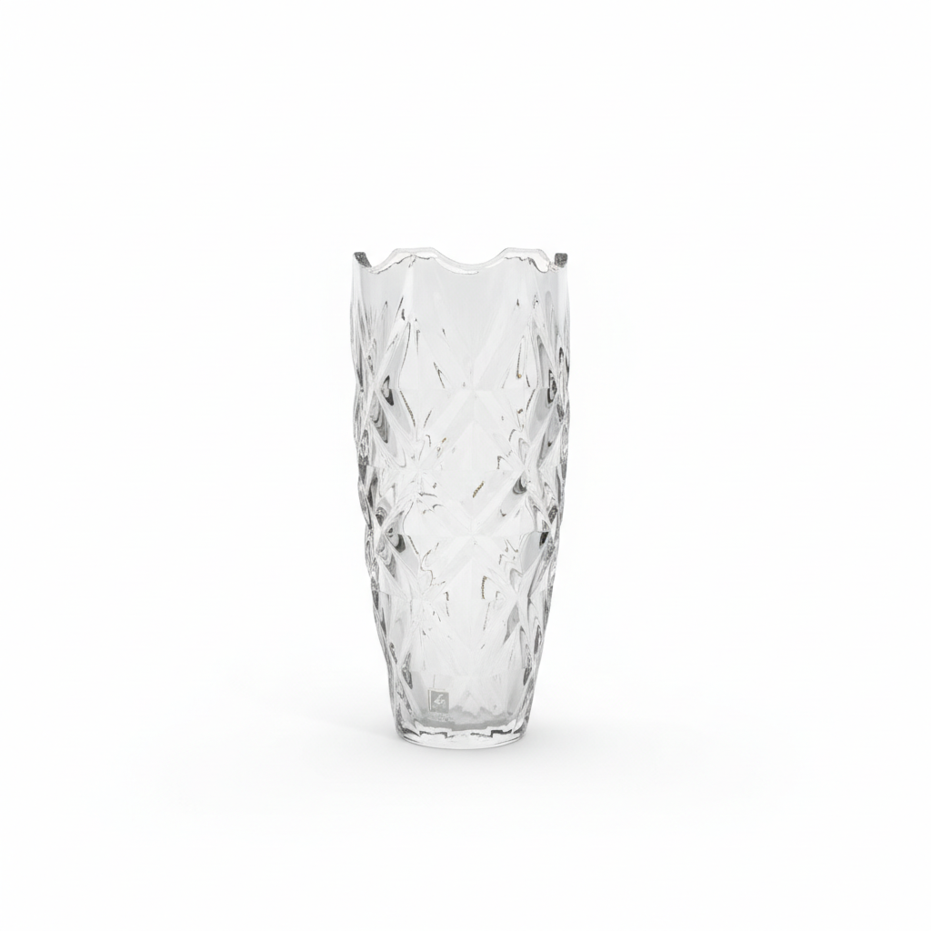 Vazo dekorative prej qelqi të pastër me formë cilindrike të lartë dhe model prerjeje gjeometrike që pasuron çdo hapësirë banimi. Sipërfaqja e teksturuar dhe buza me valë e bëjnë një aksesor elegant për ekspozim në shtëpi.