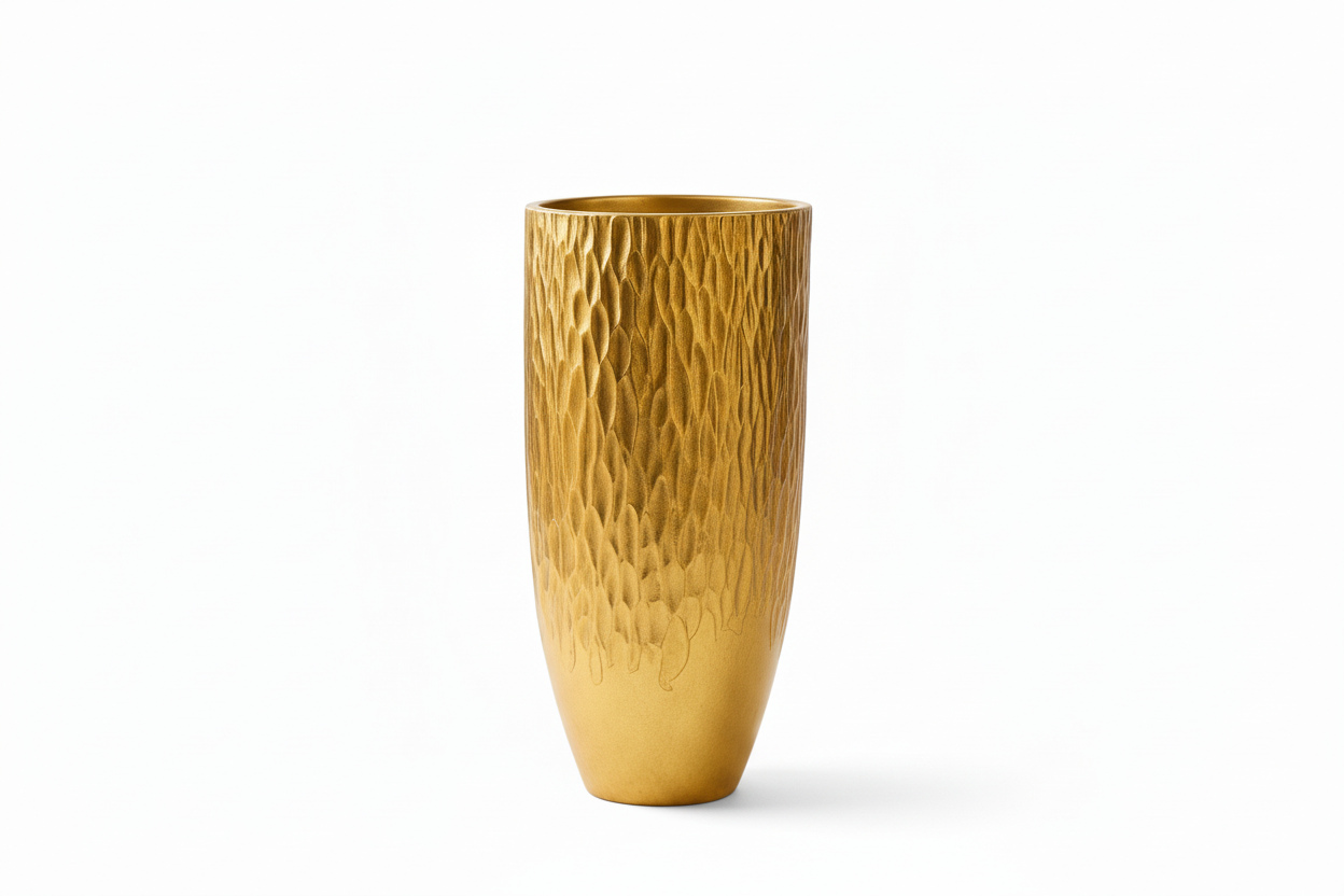Vazo dekorative me dizajn elegant dhe teksturë të punuar në sipërfaqe, që krijon një efekt të pasur vizual dhe ndjesi luksi në ambient. Ngjyra e artë e ngrohtë e bën këtë vazo një element të spikatur, ideal për hapësira moderne dhe klasike.