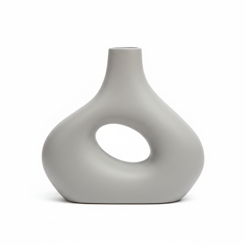 Kjo vazo me formë abstrakte dhe hapje të madhe qendrore sjell një prekje të veçantë artistike në çdo tavolinë, raft apo komodinë. Sipërfaqja e saj me teksturë të lehtë, efekt qeramike/guri dhe përfundimi gri mat kombinohen lehtë me dekorin minimalist, modern apo skandinav.