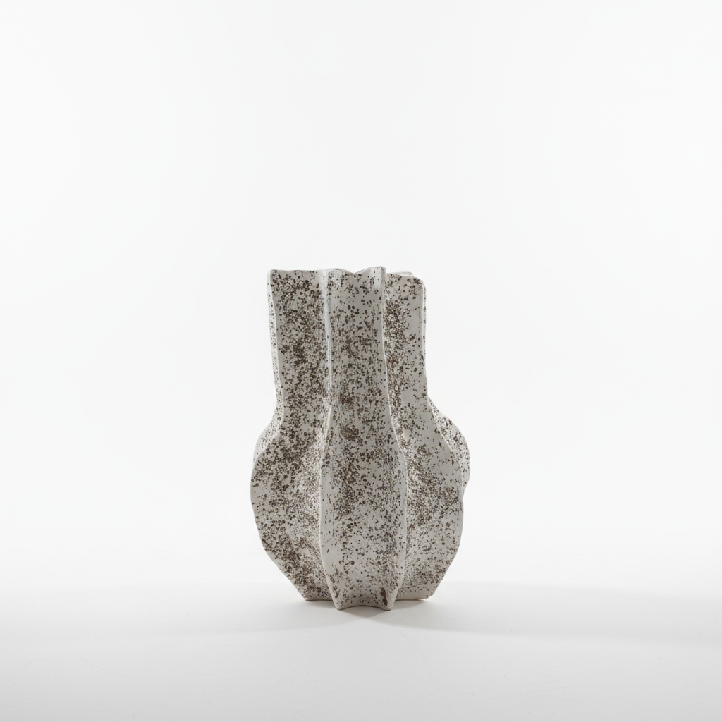 Vazo dekorative kermike me formë skulpturore valëzuese, në ngjyrë të bardhë me pika kafe, ideale për arredim modern të çdo ambienti. Pjesa e sipërme e hapur e bën të përshtatshme për shfaqjen e luleve të thata ose artificiale.