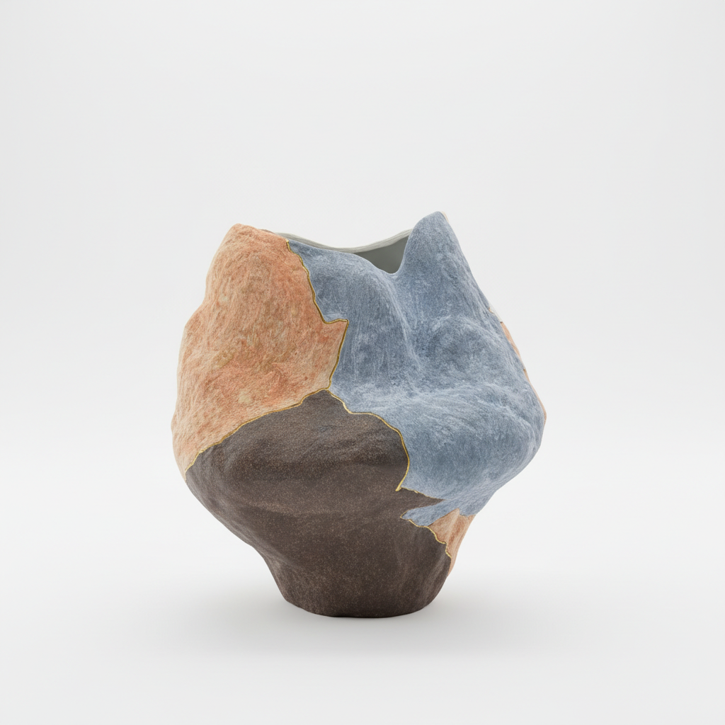 Vazo dekorative me formë organike dhe dizajn abstrakt shumëngjyrësh në nuanca blu, kafe dhe terrakote, ideale për të sjellë karakter në çdo ambient. Hapja e gjerë e sipërme e bën të përshtatshme për ekspozim dekorativ.