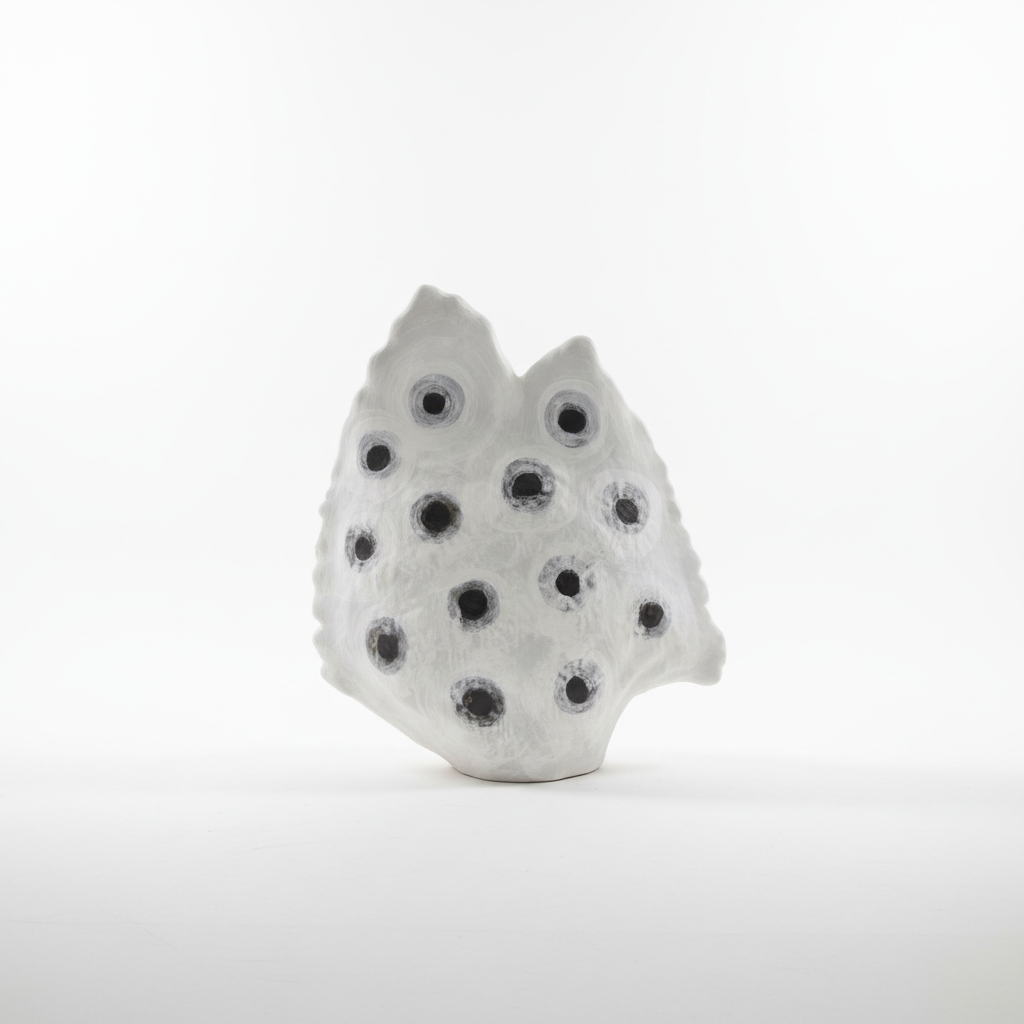 Vazo dekorative me formë abstrakte skulpturore dhe sipërfaqe të bardhë me pika rrethore në të zeza, ideale si aksent modern për çdo sipërfaqe tavoline apo rafti. Një pjesë unike që tërheq vëmendjen dhe plotëson me stil ambientet e brendshme.
