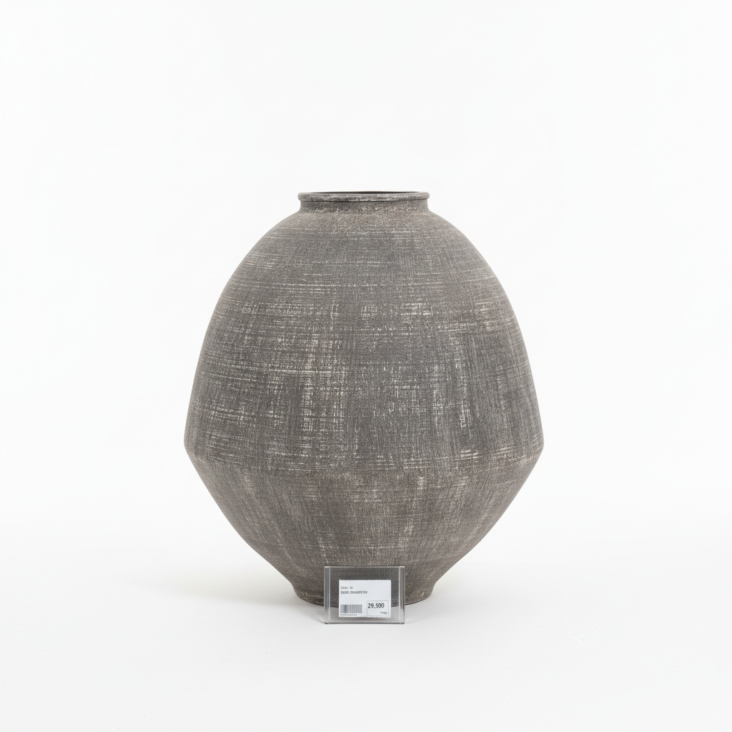 Kjo vazo dekorative e madhe rrethore gri sjell një prekje moderne dhe elegante në çdo ambient. Sipërfaqja me teksturë dhe hapja e ngushtë në pjesën e sipërme e bëjnë ideale për dekor minimal ose si objekt theksues në dhomë.