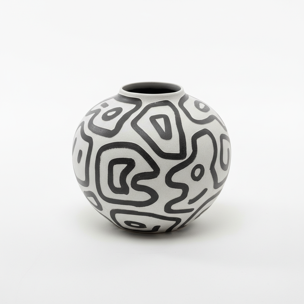 Vazo dekorative rrethore me përfundim mat dhe motive abstrakte në ngjyrë të zezë mbi sipërfaqe të bardhë, ideale për zbukurimin e tavolinave dhe rafteve. Forma e saj me trup të fryrë dhe hapje të ngushtë sjell një prekje moderne në çdo ambient.
