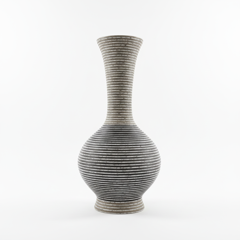 Vazo dekorative e lartë me trup të rrumbullakët dhe qafë të ngushtë, e punuar me reliev horizontal dhe vija kontrastuese bardh e zi për një pamje moderne në çdo ambient.