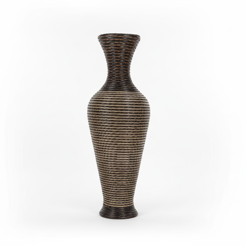 Kjo vazo dekorative me formë elegante dhe teksturë të punuar me detaje sjell një prekje natyrale dhe moderne në çdo ambient. Dizajni i saj i gjatë dhe i hollë e bën ideale për vendosje në kënde salloni, korridore, hyrje, por edhe në veranda, ballkone apo ambiente të jashtme të mbuluara.