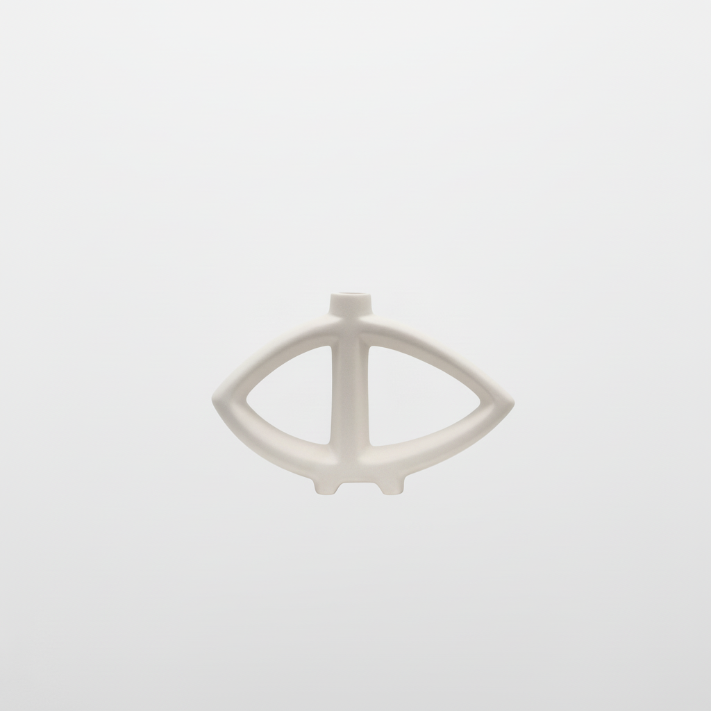 Kjo vazo dekorative me dizajn skulpturor dhe linja të pastra sjell një stil modern dhe artistik në çdo ambient. Forma e saj unike, me hapësira gjeometrike dhe ngjyrë neutrale, e bën një element dekorativ të veçantë që tërheq vëmendjen në tavolina, rafte apo komodina.