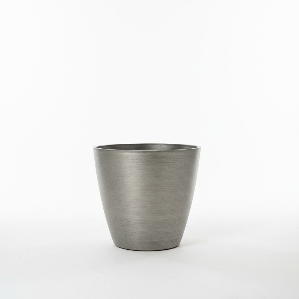 Vazo plastike XL me përfundim argjendi metalik, ideale për vendosjen e bimëve dhe luleve në shtëpi ose ambientet tuaja të brendshme. Dizajni i saj i thjeshtë dhe modern përshtatet lehtësisht me çdo stil arredimi.