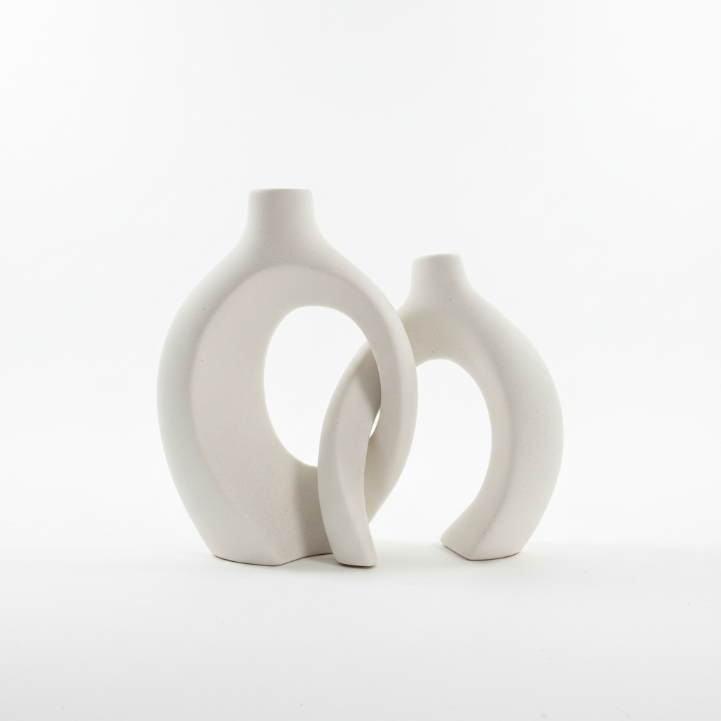 Set vazosh dekorative me forma të ndërlidhura dhe dizajn modern abstrakt, realizuar në keramikë mat me ngjyrë të çelët për një pamje elegante në çdo ambient.