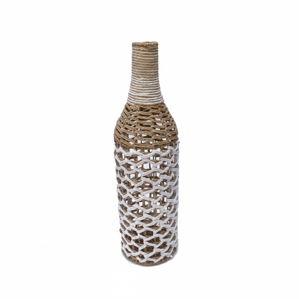 Vazo dekorative në formë shisheje, e punuar me litar natyral në dy ngjyra, sjell një prekje rustike dhe bregdetare në çdo ambient të shtëpisë. Detajet e endura krijojnë një element tërheqës vizual për raftet, komodat apo tavolinat dekorative.