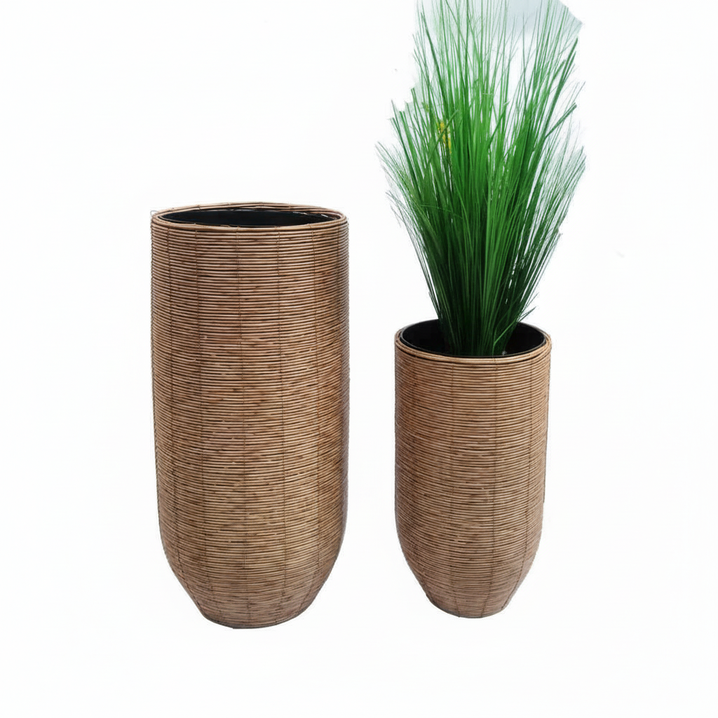 Set me dy vazo dyshemeje cilindrike me thurje ratan në ngjyrë kafe natyrale dhe enë të brendshme të zezë, ideale për bime dekorative në ambiente të brendshme. Dizajni i lartë dhe forma e ngushtuar në fund u japin bimëve tuaja paraqitje elegante.