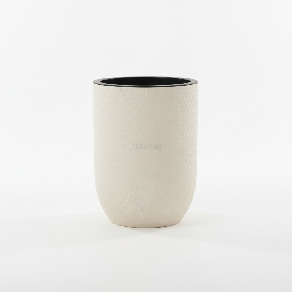 Vazo dekorative me dizajn cilindrik dhe sipërfaqe të strukturuar në ngjyrë beige neutrale, ideale për zbukurimin e çdo ambienti të brendshëm. Pjesa e brendshme e errët krijon një kontrast elegant që thekson stilin minimalist.