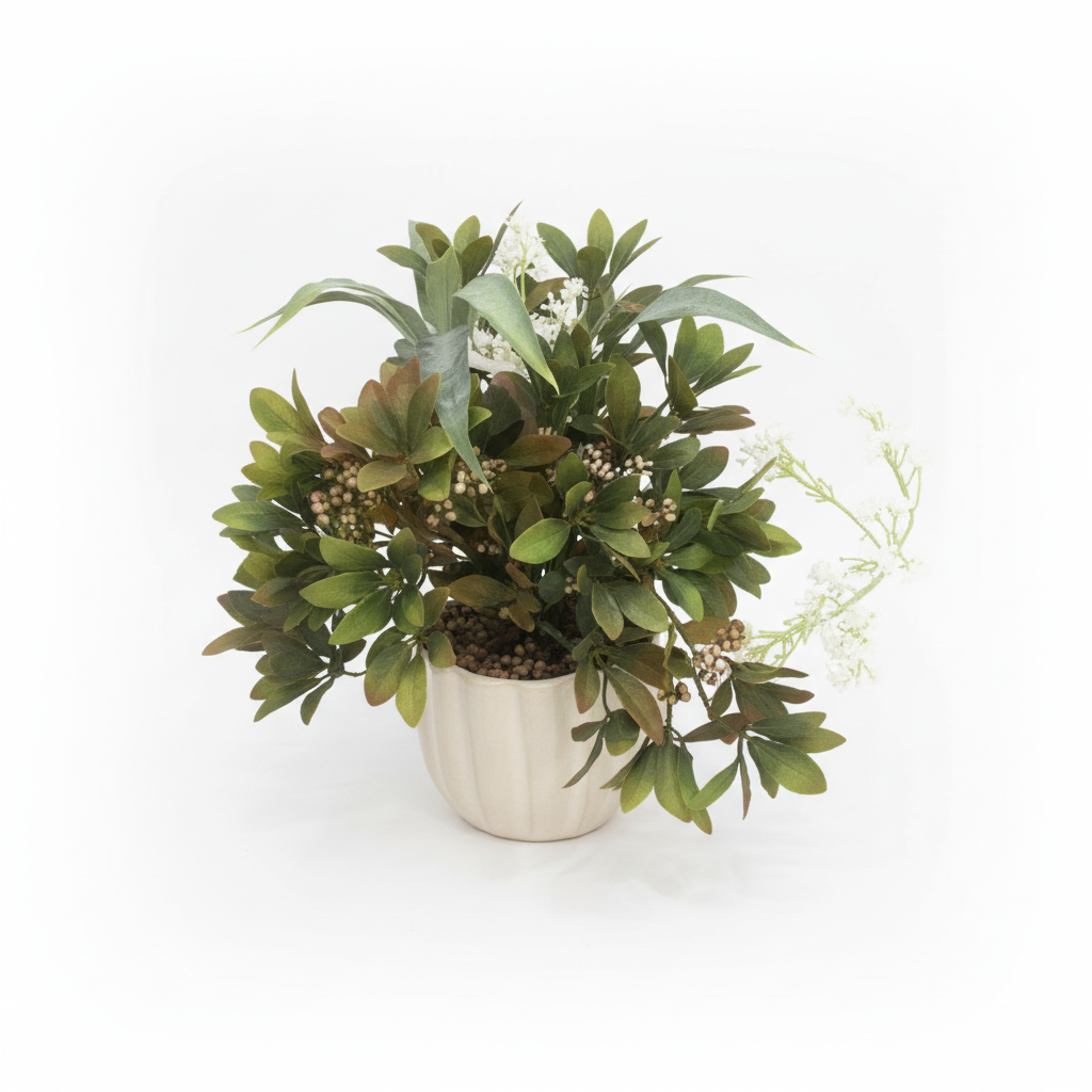 Bimë dekorative artificiale me gjethe jeshile dhe detaje të imëta, e vendosur në një vazo rrethore në ngjyrë të çelët për zbukurim të brendshëm. Një zgjidhje praktike për të sjellë gjallëri në çdo kënd të shtëpisë pa mirëmbajtje.