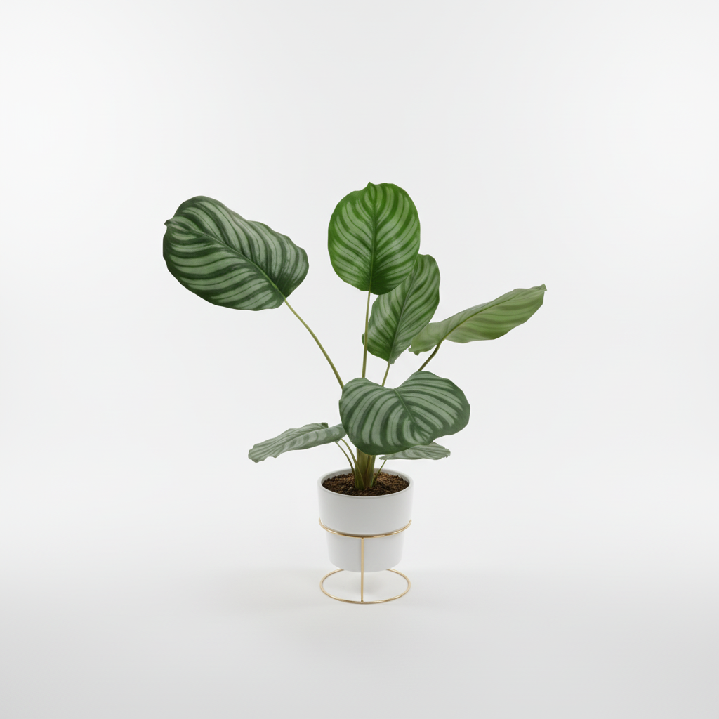 Bima dekorative me gjethe të rrumbullakëta jeshile me vija argjendi sjell një prekje natyrale elegante në çdo ambient të brendshëm. Vazoja e bardhë moderne e bën këtë bimë një element tërheqës dekori për shtëpi ose zyrë.