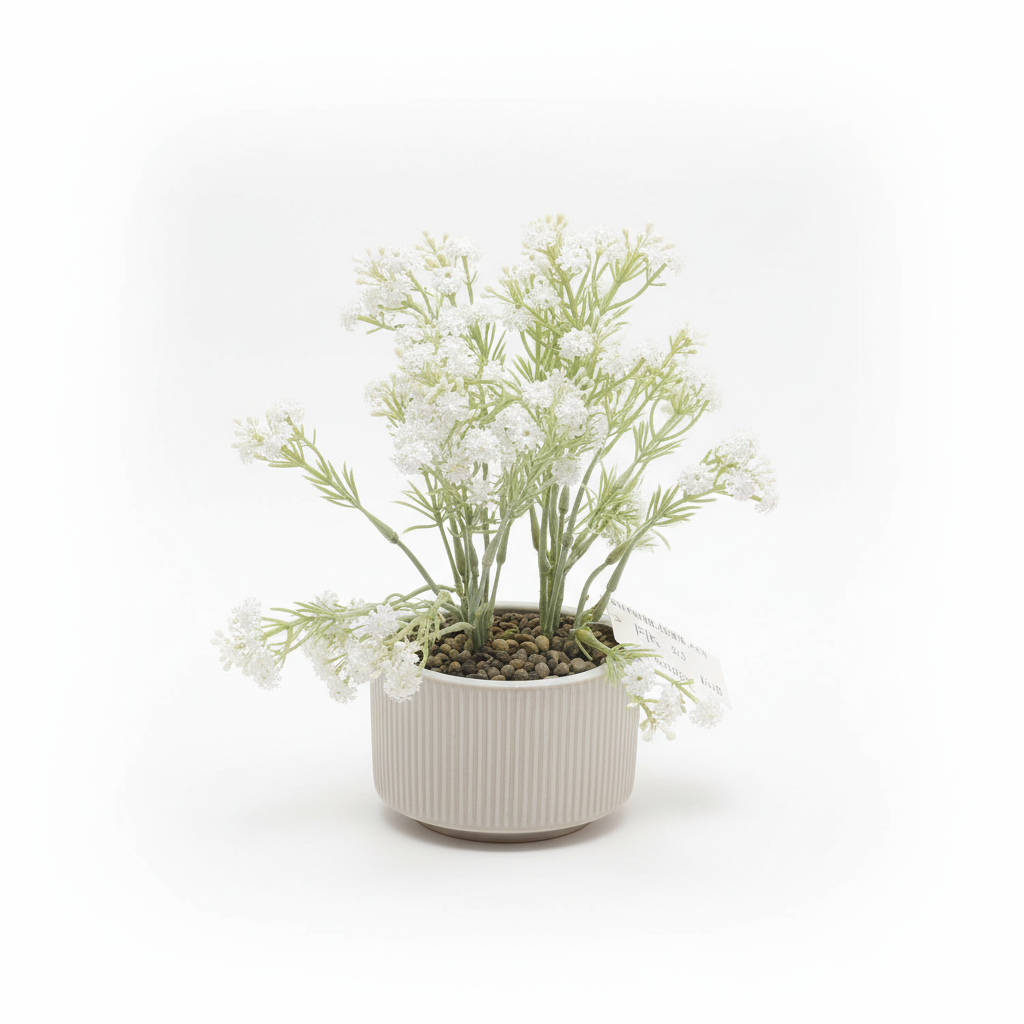 Bimë artificiale dekorative me lule të bardha të vogla të grumbulluara dhe gjethe jeshile, e vendosur në një vazo të rrumbullakët me brazda për zbukurim interieri.