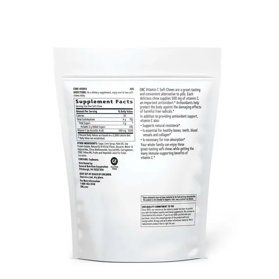 Vitamin C Soft Chews nga GNC janë suplemente të shijshme me shije portokalli që ofrojnë mbështetje të përditshme për sistemin imunitar. Çdo copë përmban 500 mg vitaminë C, duke ndihmuar në forcimin e rezistencës natyrale të trupit dhe në mbrojtjen e qelizave nga stresi oksidativ.