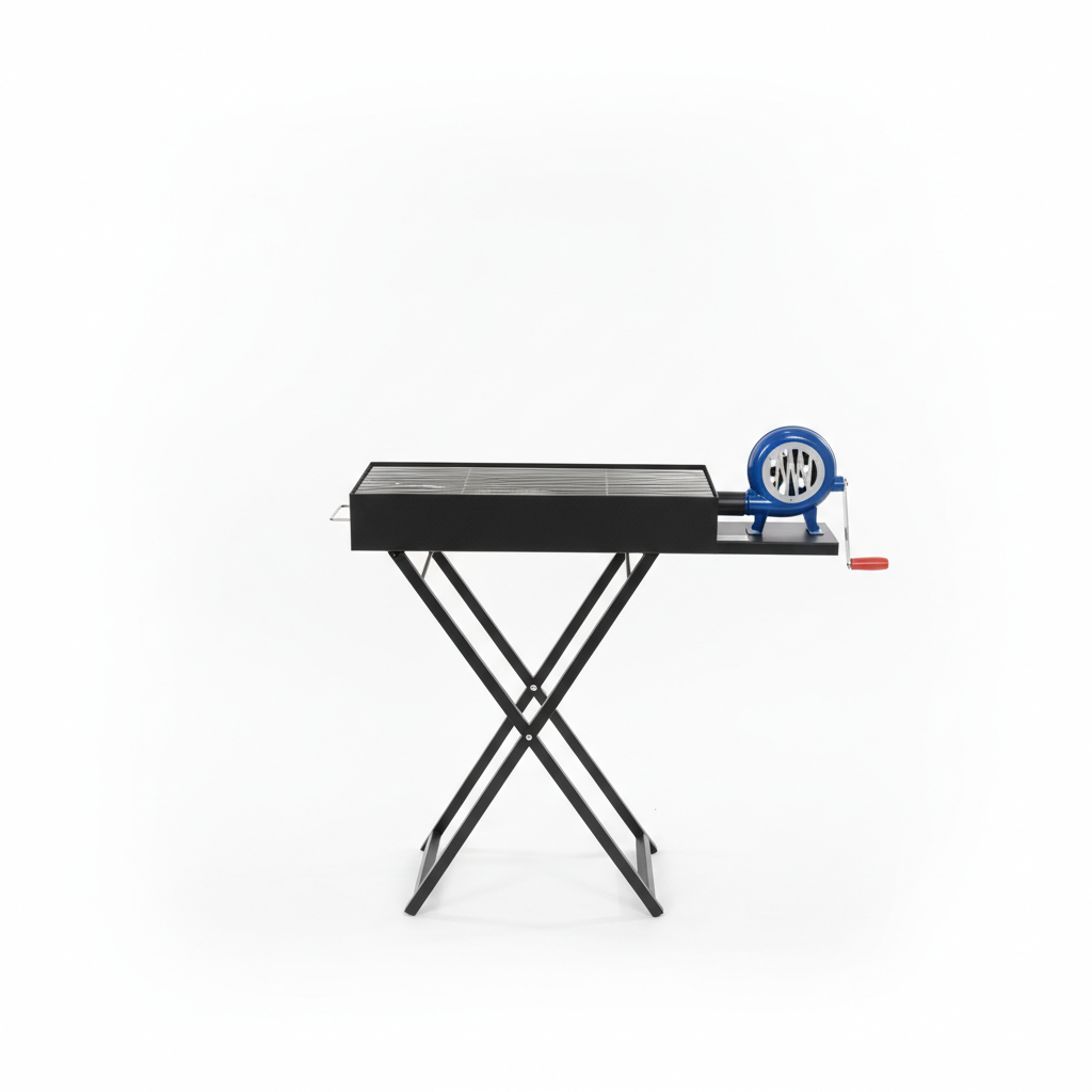E ndërtuar me konstruksion metalik të qëndrueshëm, kjo zgarë siguron stabilitet dhe jetëgjatësi gjatë përdorimit. Furrtelja me manivelë e integruar ndihmon në fryrjen manuale të zjarrit për kontroll më të mirë të nxehtësisë, ndërsa rrjeta e gatimit e heqshme lehtëson vendosjen dhe pastrimin.