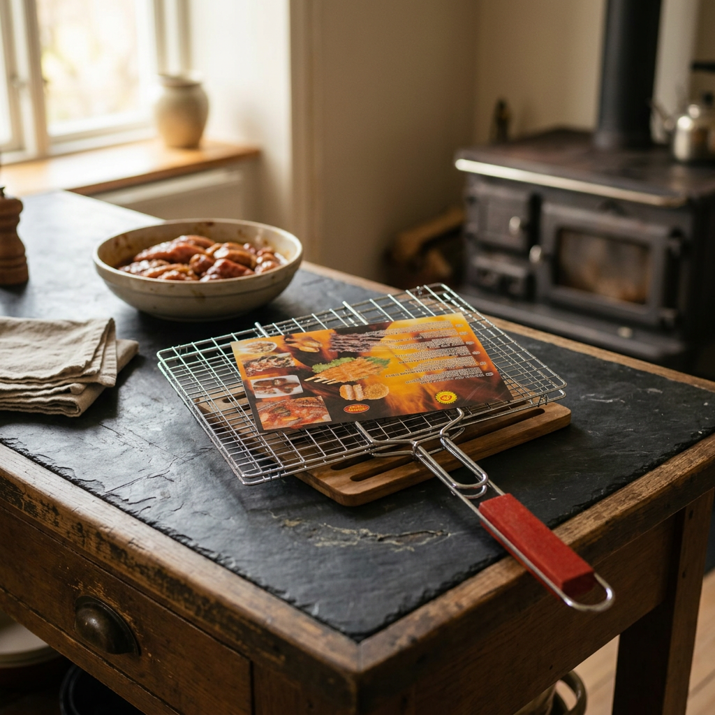 E ndërtuar nga metal rezistent, kjo zgarë siguron qëndrueshmëri dhe jetëgjatësi në përdorim. Rrjeta e dendur mban ushqimin të fiksuar dhe mundëson pjekje të njëtrajtshme, edhe për copëza të vogla. Doreza e gjatë me pjesë druri ofron kapje të sigurt dhe mbron duart nga nxehtësia gjatë gatimit.